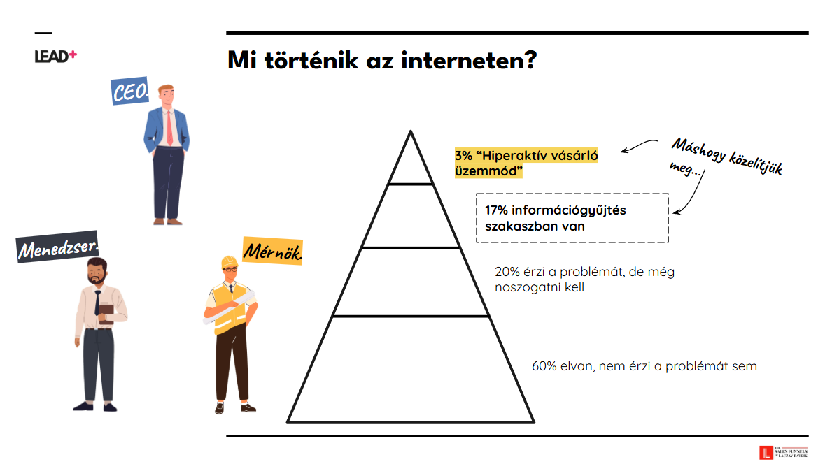 Az a cég lesz első számú, aki az észlelésben legyőz mindenkit. Ennek eszköze a B2B marketing, hogy az észlelés színpadán hitelesebbnek tartsanak – ezáltal hozzánk forduljanak az ajánlatadási szakaszban.